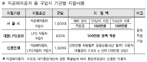 신차 구매 지원금은 5등급 차주가 조기폐차 후 4개월 이내 환경부장관이 인증한 저공해자동차 또는 LPG 사용 자동차를 구매한 후 지원금을 신청하면 서울시, 대한LPG협회, 신한은행이 심사 후 지원한다. 이는 기존 조기폐차 보조금과 별도로 추가 지원하는 혜택이다.