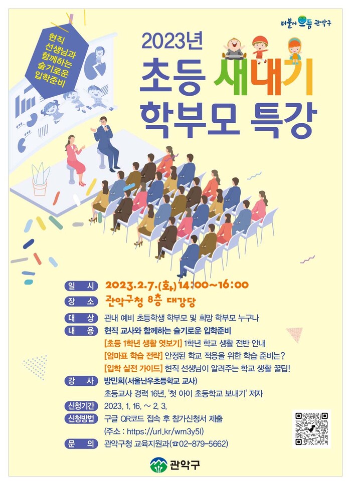 [로컬세계 = 임종환 기자]서울 관악구가 예비 초등학교 학부모들을 위한 ‘2023학년도 초등학교 새내기 학부모 특강’을 오는 2월 7일 오후 2시 관악구청 8층 대강당에서 개최한다.