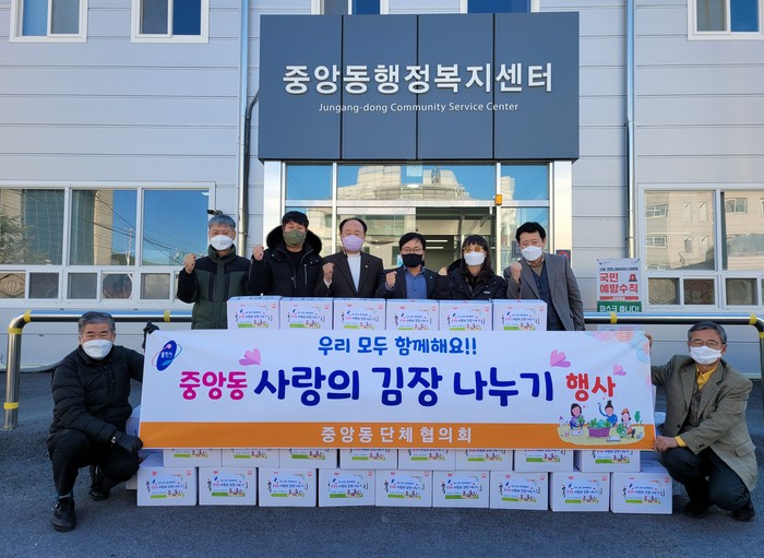 | ▲중앙동에 단체협의회가 500만원 상당의 김장김치 132박스를 전달했다. |