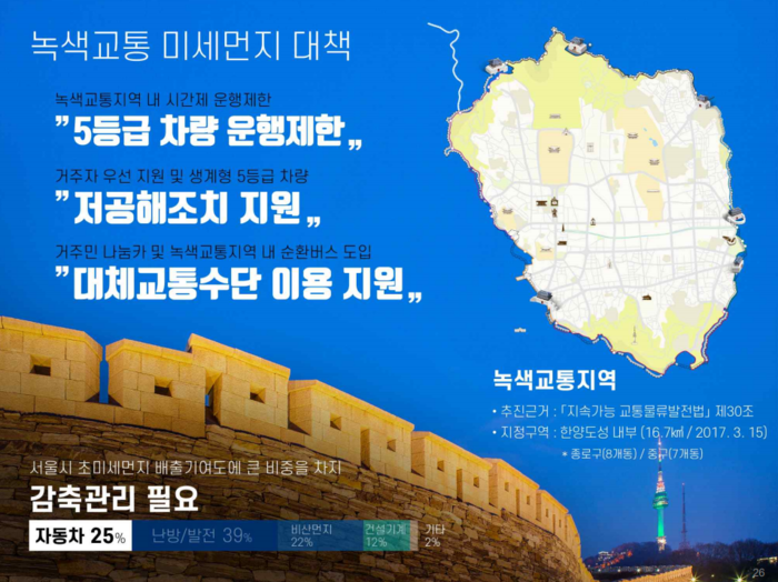 5등급 차량만 하루 2~3만대(추산)가 오가며 대기오염물질을 배출하고 있는 한양도성 내 16.7㎢ ‘녹색교통지역’의 5등급 차량운행제한도 오는 7월 1일부터 시범 운영을 거쳐 12월 1일부터는 과태료를 부과한다. 물류이동 등을 고려해 06시부터 19시~21시 사이 시간대 중 시간제로 실시하는 방안을 검토 중이다. 녹색교통지역 내 거주자 5등급 차량은 3727대로 조기폐차 보조금 한도액을 165만원에서 300만원으로 2배 가까이 상향하는 등 제도 시행 전까지 저공해 조치를 완료할 계획이다.
