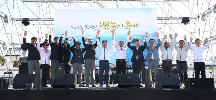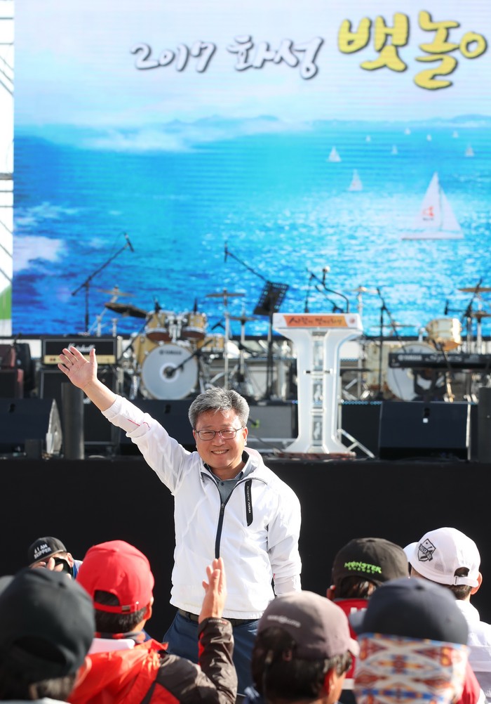 | ▲2017 화성 서해안컵 전국 요트대회 개막식에 참석한 채인석 화성시장이 관람객들을 향해 손을 흔들고 있다. |