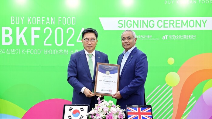 ▲ 한국농수산식품유통공사 김춘진 사장(왼쪽), 영국 유니스낵 하이드 하니퍼 대표(오른쪽) |