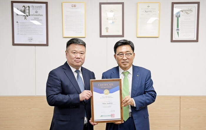 ▲ 글로벌 저탄소 식생활 홍보대사 위촉. 한국농수산식품유통공사 김춘진 사장(오른쪽), 카자흐스탄 신라인 신안드레이 회장(왼쪽) / aT 제공 |