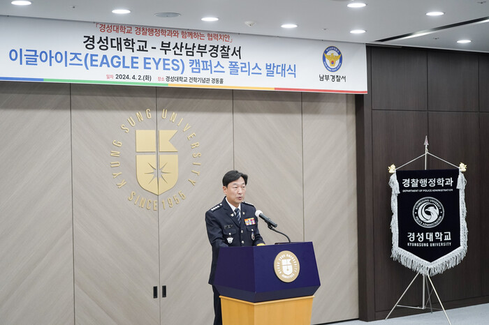 [로컬세계 부산=맹화찬 기자]부산남부경찰서는 2일 경성대학교 경동홀에서 경학교류협력을 통한 공동체 중심 예방 치안확보를 위해 남부경찰서-경성대학교 대학생순찰대 이글아이즈(EAGLE EYES) 발대식을 열었다.