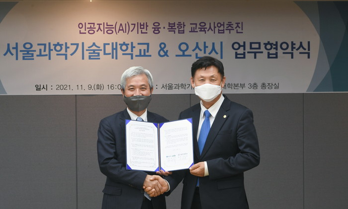 [로컬세계 김병민 기자]곽상욱 오산시장은 9일 서울과학기술대학교 이동훈 총장과 양 기관이 AI(인공지능) 융·복합 교육 추진을 위해 적극 협력한다는 내용의 상호 업무협약을 체결했다.