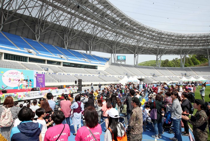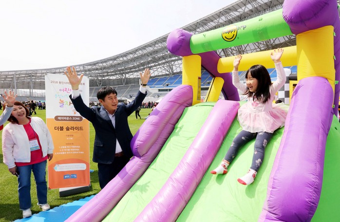 이날 시민체육공원 주경기장도 어린이들의 놀이공간으로 탈바꿈했다. 시민들은 용인시어린이집연합회가 이곳에서 연 ‘어린이날 대축제’를 마음껏 즐겼다.