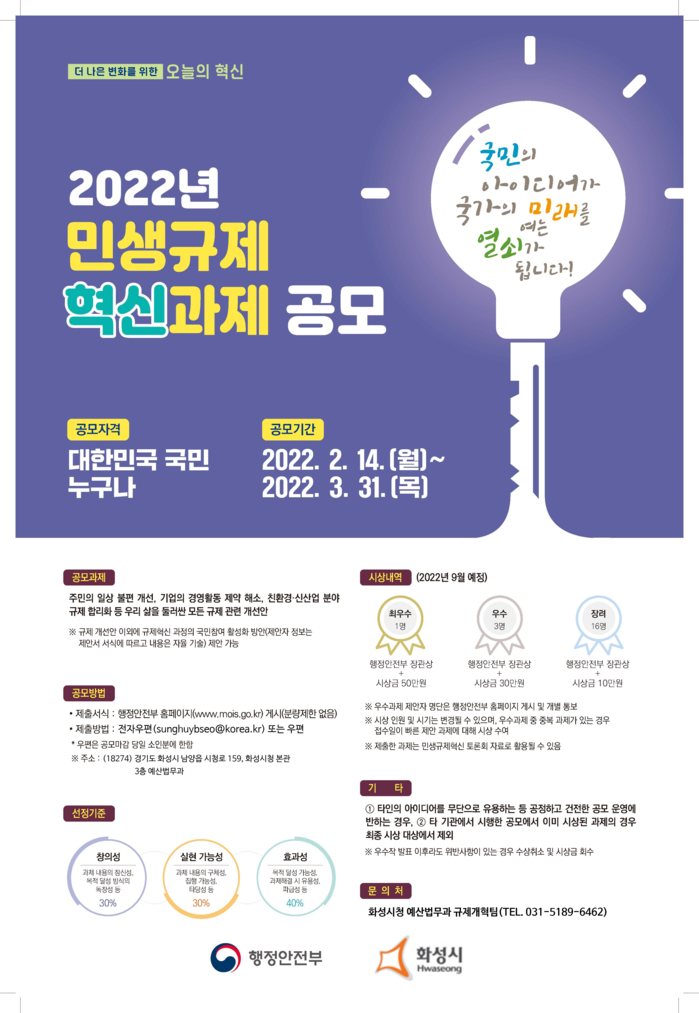 공모와 관련한 자세한 사항은 화성시청 홈페이지 규제개혁 알림방에서 확인할 수 있다.