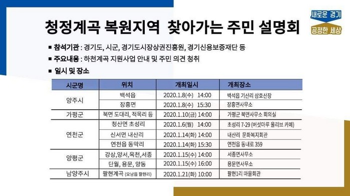 도는 이번 주민설명회를 통해 불법시설물 철거에 동참해준 지역주민 및 상인들의 실질적인 생계대책 방안은 물론 불법시설물 없는 ‘청정계곡’으로 거듭나고 있는 도내 하천 및 계곡을 전국적인 관광명소로 개발하는 방안 등에 관한 다양한 주민 의견을 수렴할 계획이다.