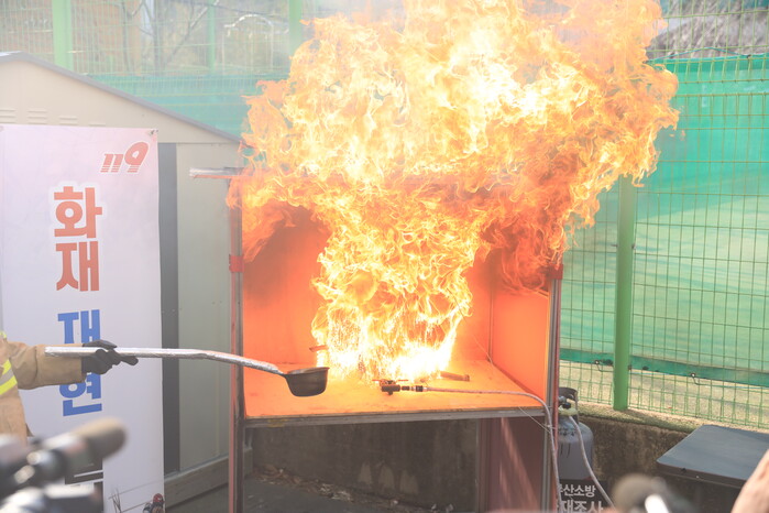 [로컬세계 부산=맹화찬 기자]부산소방재난본부(본부장 이상규)은 “안전한 설 명절 보내기 일환으로 식용유를 이용한 음식물 조리 시 발생할 수 있는 화재의 위험성에 대해 18일 오후 소방본부 화재조사시험분석실 앞 공터에서 화재 재현 실험을 실시했다”고 밝혔다.