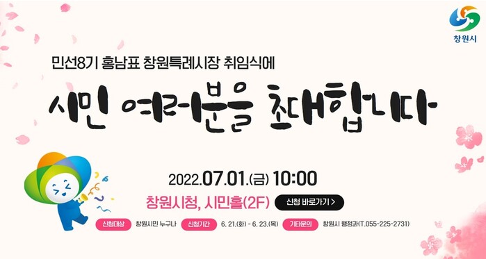창원특례시장 취임식에 참여하고자 하는 시민은 6월 23일까지 창원특례시 홈페이지 취임식 참여 희망 코너에 접속해 신청하면 된다.