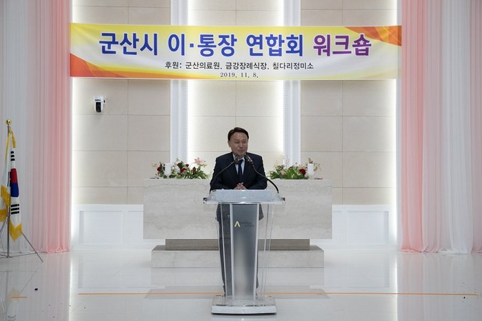 ▲강임준 군산시장이 이·통장 워크숍에서 인사말을 하고 있다.(군산시 제공) |