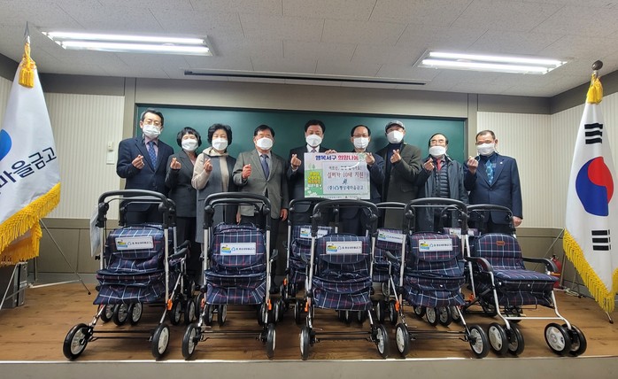 [로컬세계 박세환 기자]대구시 서구 평리동 소재 평상새마을금고(이사장 장기덕)에서는 지난 21일 새마을금고 2층 회의실에서 거동이 불편해 외부 활동이 어려운 홀몸어르신에게 ‘손과 발이 되어주는 사랑의 실버카 전달식’을 가졌다.