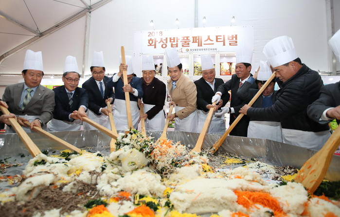 | ▲축제에서 주요 내빈들이 대형 비빔밥을 만들고 있는 모습.(화성시 제공) |
