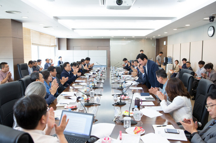이번 회의는 업무 현황을 점검하고 경기도지사 취임식에 대해 논의했다.