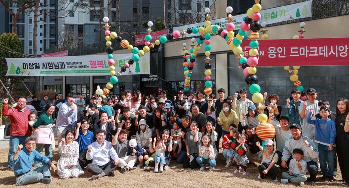 ▲ 이상일 용인특례시장(앞줄 왼쪽에서 세번째)이 지난 13일 처인구 중앙동 드마크데시앙 입주 기념 식목행사에 참여해 참석자들과 기념촬영을 하고 있다. |