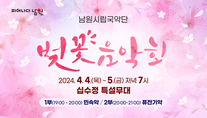 [로컬세계=이태술 기자]전북 남원시립국악단이 벚꽃과 함께 다양한 장르의 국악을 즐기는 ‘벚꽃음악회’를 오는 4일부터 5일까지 저녁 7시 요천 십수정 특설무대에서 펼친다.