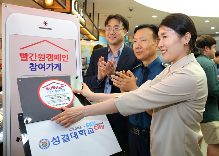 [로컬세계 주덕신 기자]경기남부지방경찰청은 30일 오후 안양시 안양동 소재 성결대학교에서 이기창 경기남부청장과 홍보단, 성결대학교 내 참여가게 신청 점주, 대학생 등 50여 명이 참여한 가운데 ‘빨간원 캠페인 참여가게 1호점’ 인증행사를 가졌다.