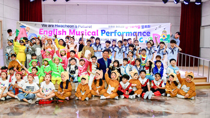 [로컬세계 = 전경해 기자] 화천커뮤니티센터 온종일 돌봄교실 영어뮤지컬 발표회가 9일 화천커뮤니티센터 지하 1층 공연장에서 최문순 군수를 비롯한 학부모 200여 명이 참석한 가운데 열렸다.(사진=화천군 제공)