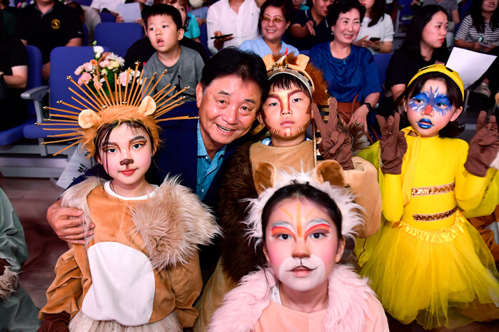 ▲ 최문순 화천군수가 화천커뮤니티센터 온종일 돌봄교실 영어뮤지컬 발표 어린이들과 기념촬영을 하고 있다. |