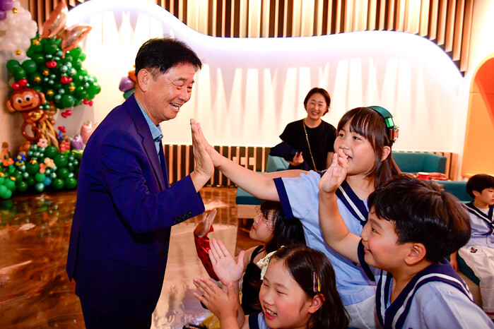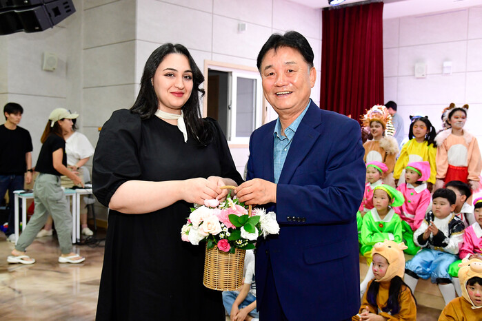 ▲ 최문순 화천군수가 화천커뮤니티센터 온종일 돌봄교실 영어뮤지컬 발표 어린이들을 격려하고 있다. |