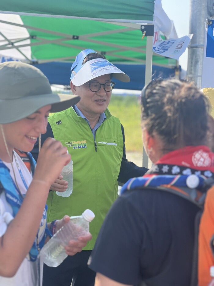 ▲ 이재식 농협중앙회 부회장은 7일 새만금 잼버리 야영장에서 참가자들에게 얼음물을 나눠주고 있다. 농협 제공 |
