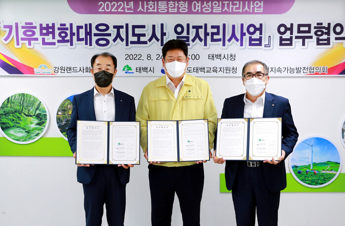 [로컬세계=박상진 기자]강원 태백시(시장 이상호)와 강원랜드 사회공헌재단(이사장 심규호), 강원도태백교육지원청(교육장 이용훈), 태백지속가능발전협의회(회장 함억철)는 24일 기후변화대응지도사의 안정적인 일자리 기반과 지속 가능한 여성 일자리 발전을 위한 ‘기후변화대응지도사 일자리사업 업무협약식’을 개최했다.
