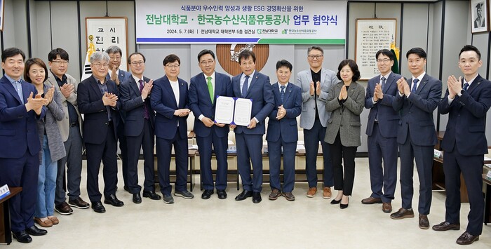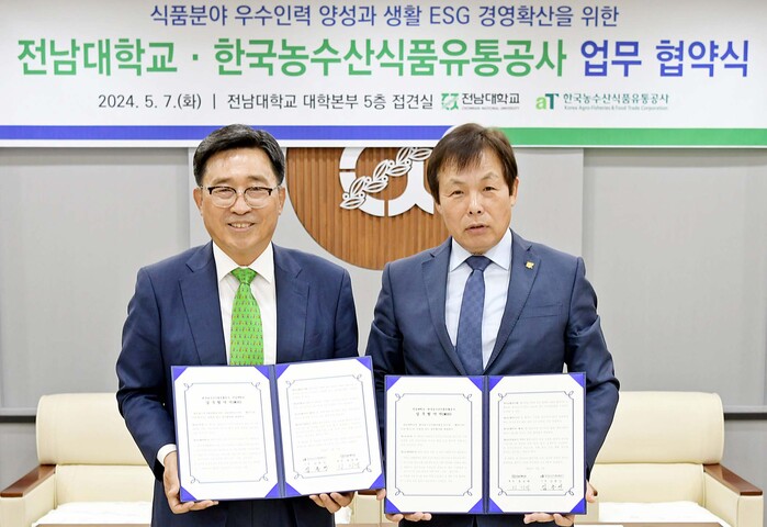 한국농수산식품유통공사(사장 김춘진)와 전남대학교(총장 정성택)는 7일 전남대학교에서 푸드테크 등 농수산식품 미래 인재 육성과 저탄소 식생활 확산을 위한 업무협약을 체결했다.
