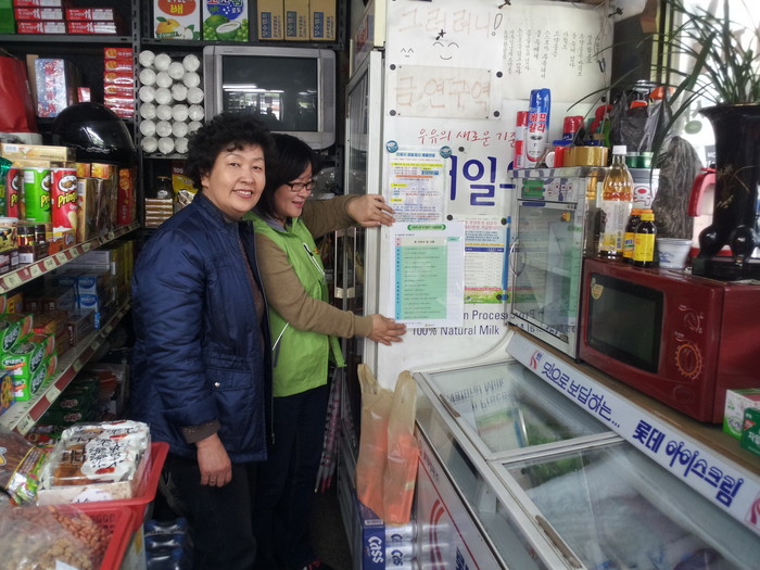 ▲학부모식품안전지킴이로 위촉된 점검반이 학교주변 슈퍼에서 어린이 정서 저해 식품이 진열돼 있는지를 살펴보고 있다. |