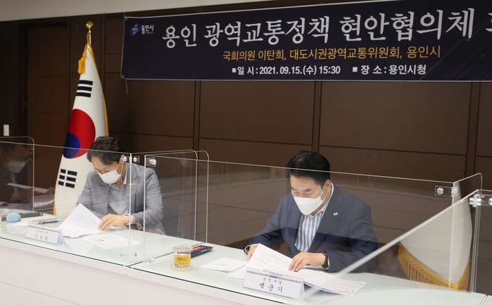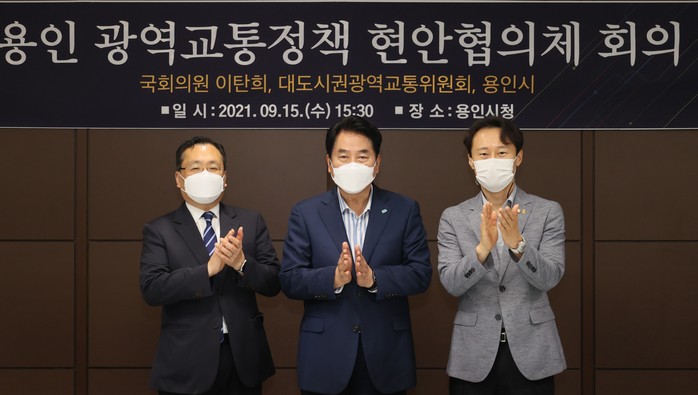 [로컬세계 김병민 기자]백군기 경기 용인시장은 15일 시청 시장실에서 이탄희 국회의원, 김규현 대도시권광역교통위원회 본부장과 만나 M버스 등 광역교통정책 개선방안을 논의했다.