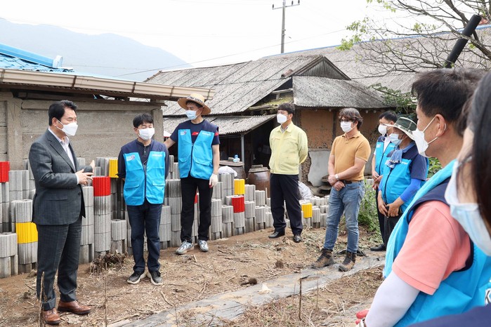 [로컬세계 김병민 기자]백군기 용인시장이 9일 (사)한국빗물협회가 홀로 어르신을 위해 진행하고 있는 담벼락 보수 현장에 방문해 관계자들에게 감사 인사를 전하고 어르신의 안부를 살폈다.