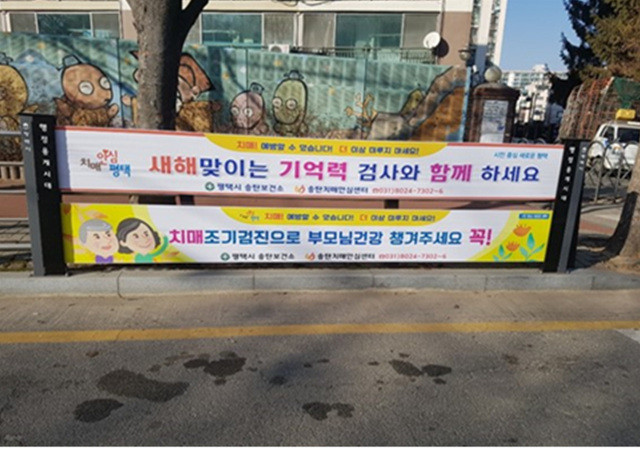 | ▲만65세이상 어르신들을 위한 무료 치매조기검진 및 치매안심센터를 홍보하는 거리 현수막.(평택시 제공) |