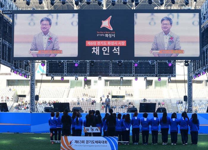 바로 채인석 화성시장의 PT쇼다. 역대 도민체전에서의 환영사가 식순의 구색을 맞추기 위해 교장 선생님 훈화말씀 같던 환영사를 낭독하는 게 전부였기에, 이번 채인석 화성시장의 PT쇼는 그야말로 파격이다. 이는 화성을 찾은 선수단과 경기도민들에게 이 기회에 달라진 화성을 제대로 각인하겠다는 의지와 열정이 담겨있다.