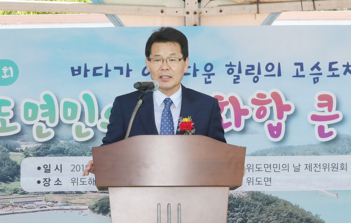 ▲권익현 군수가 13일 위도 해수욕장 야외공연장에서 열린 '제23회 위도 면민의 날 화합 큰 잔치'에서 인사말을 하고 있다. |