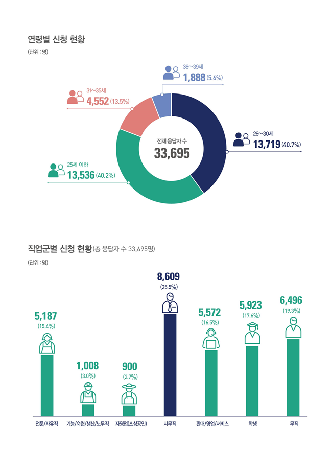 직업군으로는 사무직(25.5%)이 가장 많았고, 이어서 무직(19.3%), 학생(17.6%), 판매/영업/서비스(16.5%), 전문/자유직(15.4%) 순으로 신청했다.