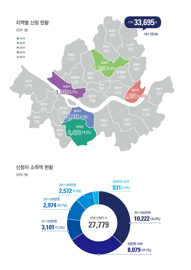 서울 지역에서 고시원이 가장 많이 위치한 관악구에서 6,472명(19.2%)으로 최다 신청했다. 이어서 광진구(6.6%), 동작구(6.3%), 마포구(5.7%), 성북구(5.3%) 순이었다.