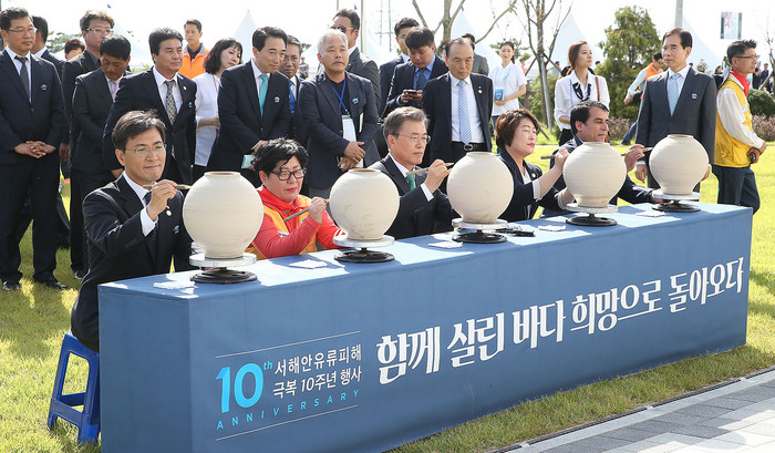 도는 이날 만리포해수욕장 희망무대에서 지역 주민과 자원봉사자, 문재인 대통령, 안희정 지사, 김부겸 행정안전부 장관, 김영춘 해양수산부 장관 등 3000여 명이 참석한 가운데 ‘유류피해 극복 10주년 기념식’을 개최했다.