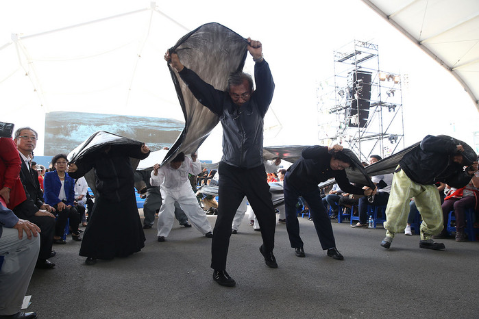 ▲문재인 대통령과 안희정 지사가 지역주민들과 함께 서해안유류피해 극복 퍼포먼스를 펼치고 있다. |