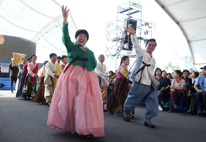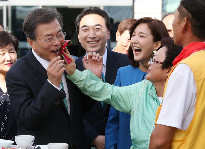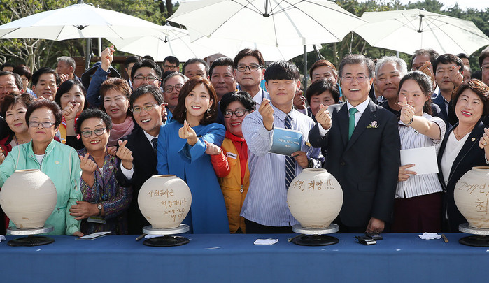 ▲문재인 대통령과 안희정 지사, 자원봉사자들이 희망항아리 만들기 퍼포먼스를 펼치고 있다. |
