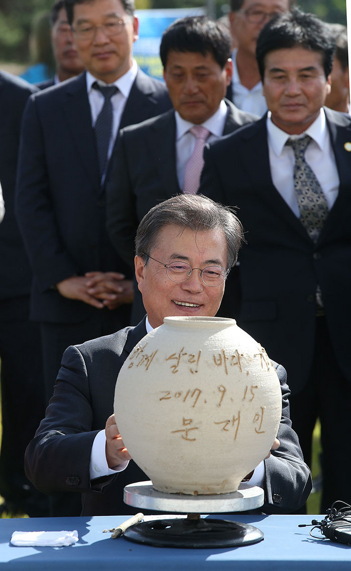 ▲문재인 대통령이 희망항아리에 함께살린 바다 희망으로 돌아오다 동참 서명을 하고 기뻐하고 있다. |