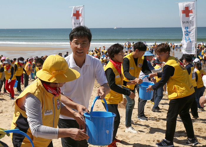 안희정 지사는 기념식에 앞서 진행된 자원봉사자 희망나눔 걷기대회에서 서해안 유류피해 극복에 힘을 보태준 자원봉사자와 대한민국 국민께 감사의 뜻을 전했다.