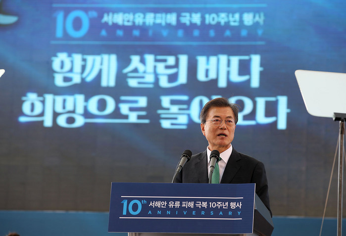 ▲문재인 대통령이 지난 15일 '서해안 유류피해극복 10주년 행사'에 참석해 기념사를 하고 있다. |