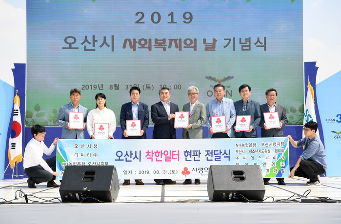 | ▲'착한일터' 현판 전달 및 기념촬영 모습.(오산시 제공) |