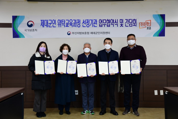 [로컬세계 부산=맹화찬 기자]부산지방보훈청(청장 임성현) 제대군인지원센터는 14일 부산예일직업전문학교,㈜코마스인증원, (사)한국경비협회부산울산경남지방협회, 동부산중장비학원 등 4개 위탁교육기관과 업무협약을 맺었다고 밝혔다.