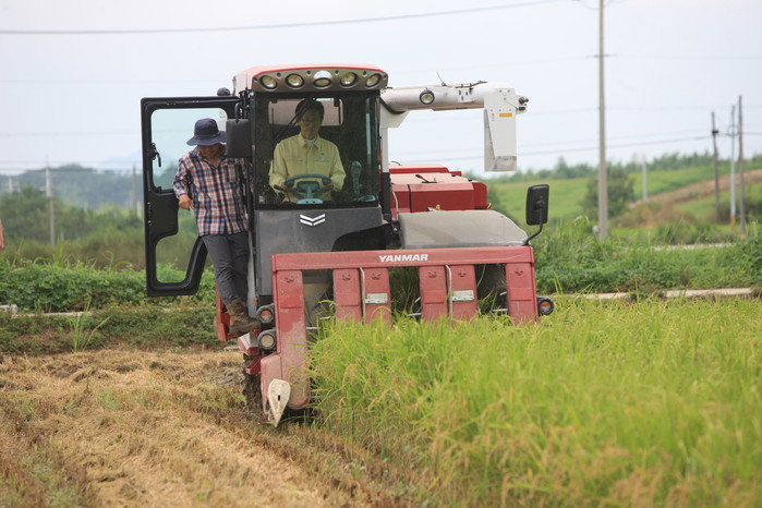 유기상 고창군수는 첫 벼 베기 현장에 참석해 직접 콤바인을 이용해 벼를 수확하고, 낟알 상태를 살피는 등 농민과 첫 수확의 기쁨을 함께했다.