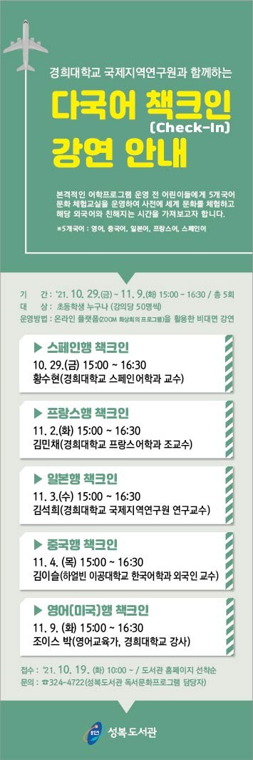 성복도서관 관계자는 “여행을 할 때 체크인이라는 절차가 빠지지 않는 것처럼 이번 강의를 통해 현지를 여행하는 기분을 느낄 수 있도록 책크인이라는 이름을 지었다”며 “학생들이 외국어에 대한 두려움을 떨칠 수 있는 좋은 기회가 되길 바란다”고 말했다.
