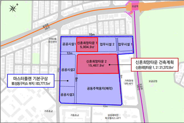 총 8만3777.5㎡ 부지에 ▲신혼희망타운 700호를 포함해 총 1300세대의 공공·민간 주거단지 ▲복합 비즈니스·창업 공간 ▲문화·체육, 청소년 시설 같은 공공시설 등이 들어선다.