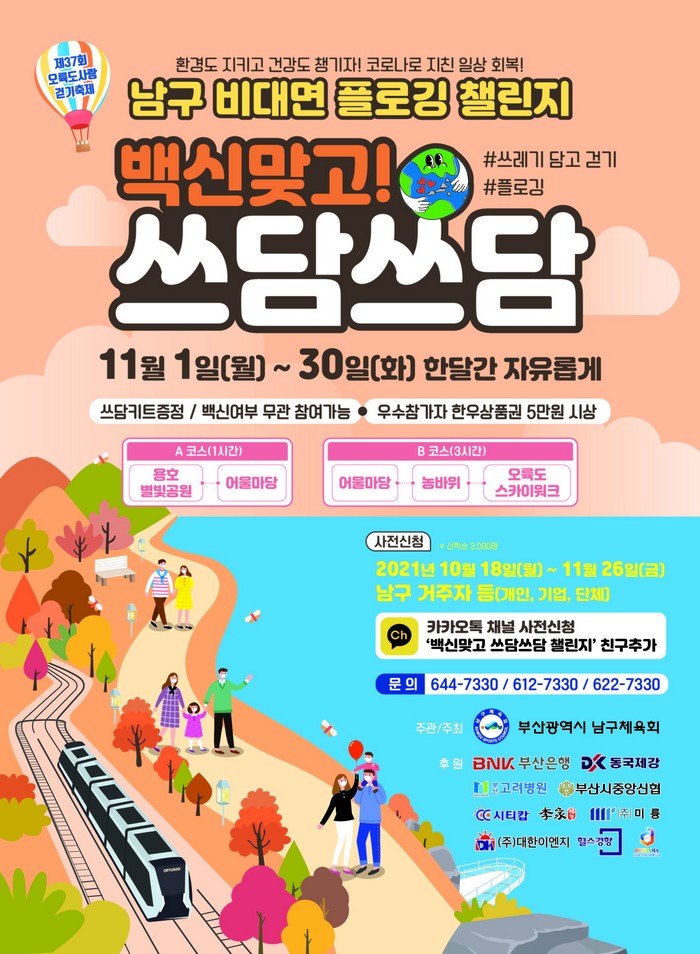 [로컬세계 맹화찬 기자]부산남구체육회(회장 정춘식)가 주관하고 부산 남구(구청장 박재범)가 후원하는 ‘백신맞고 쓰담쓰담’ 비대면 플로깅 캠페인이 11월 1일부터 11월 30일까지 한 달간 이기대와 오륙도 일원에서 개최된다.