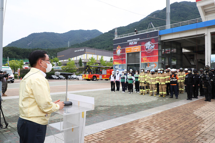 ▲홍남표 시장이 23일 창원축구센터 주경기장에서 열린 대 테러 및 화재 대비 종합실제훈련에 앞서 격려사를 하고 있다. |