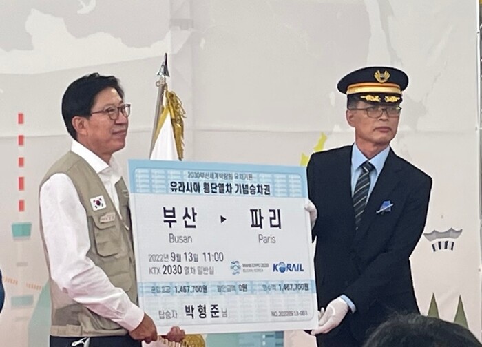 [로컬세계 부산=맹화찬 기자] 한국철도는 13일 부산역에서 개최된 2022 유라시아 시민대장정 출정식에서 ‘<부산~파리> 유라시아 횡단열차 기념승차권’을 박형준 부산시장에게 전달했다.
