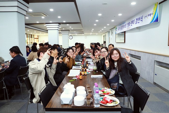 ▲26일 시청 구내식당에서 열린 멘토-멘티 결연식에 참여한 선배공무원과 신규 공무원들이 포즈를 취하며 사진을 찍고 있다.(태백시 제공) |